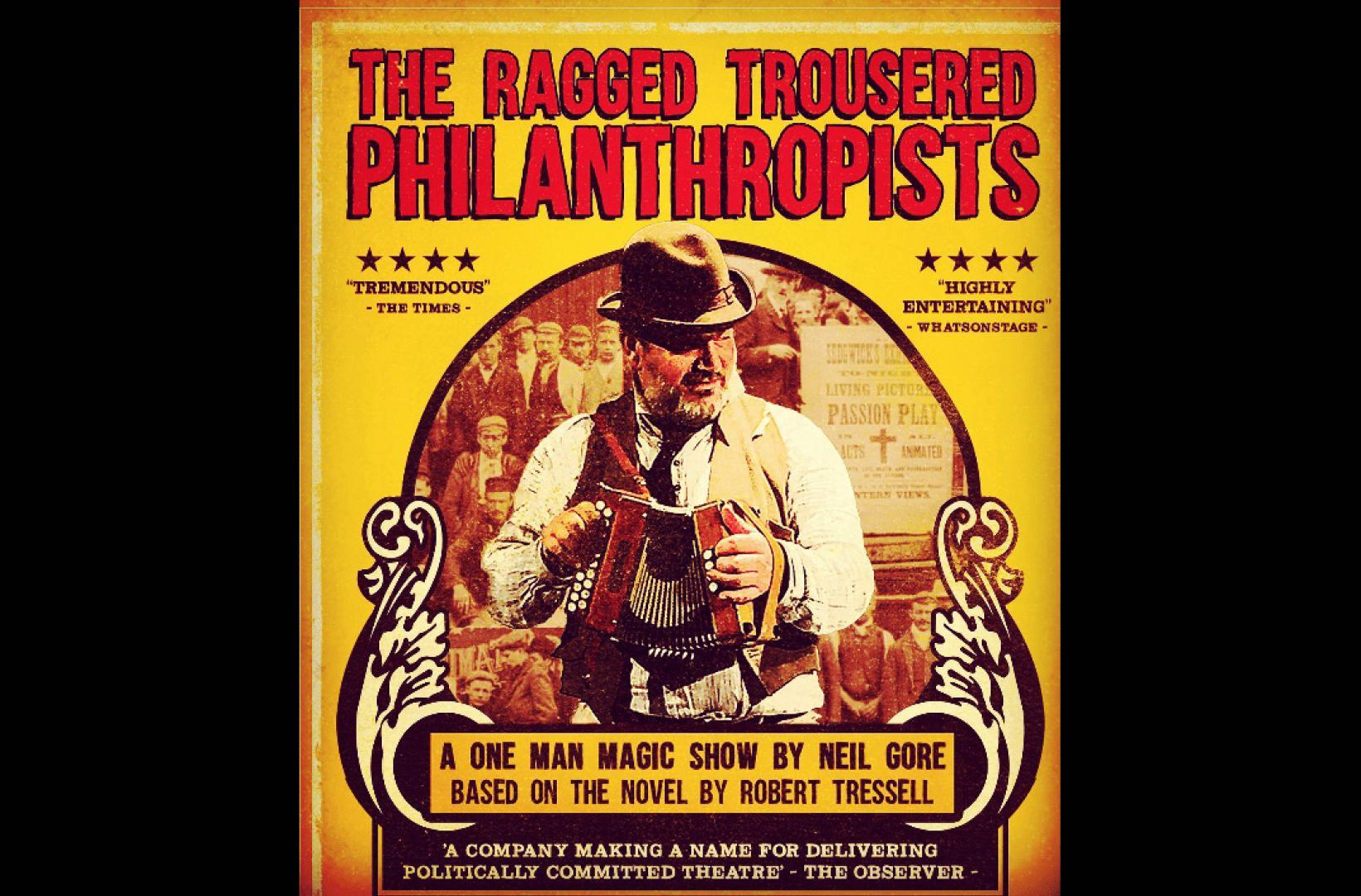 Neil Gore presents a one-person version of the classic novel by Robert Tressell featuring projection, political conjuring tricks, live music and song. Meet the famous characters and enjoy the scenes, speeches and songs, featuring the Great Money Trick as its centrepiece.