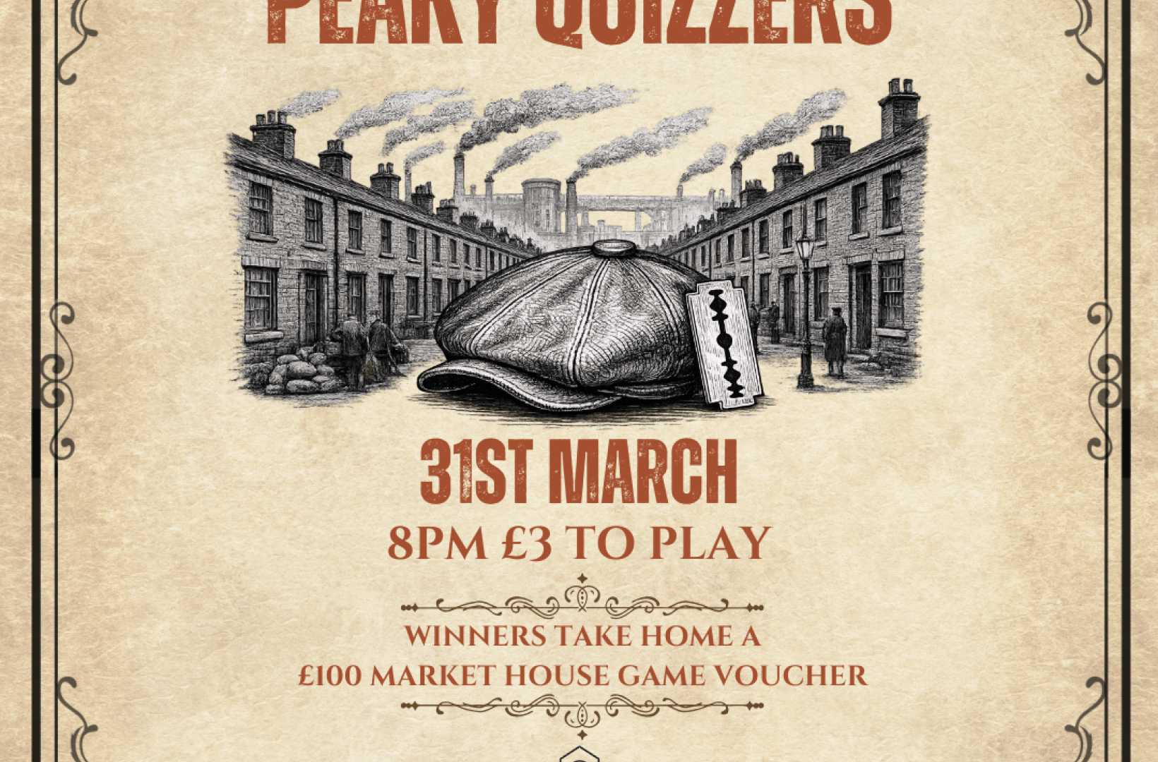 By Order of the Peaky Quizzers. March brings a quiz night inspired by flat caps, razor-sharp suits, smoky backrooms, and a notorious Birmingham family.