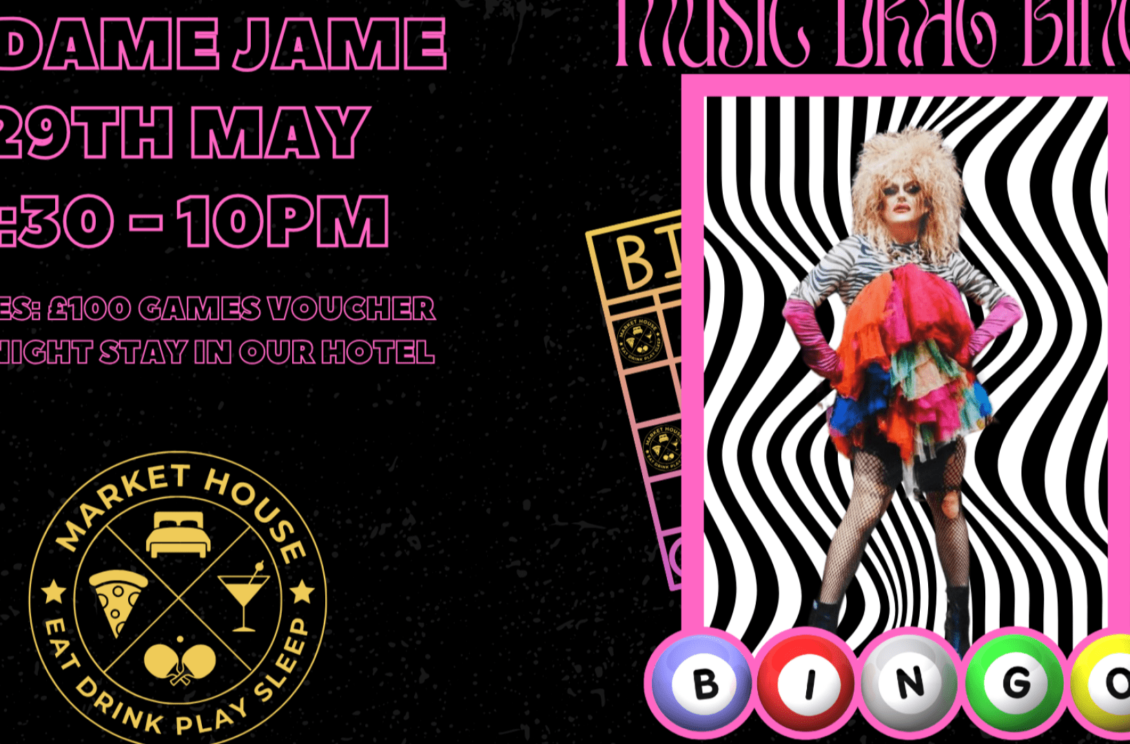 Get ready to dance at Music Drag Bingo, hosted by the fabulous Dame Jame! For just £5, grab a bingo card and try your luck at winning an exciting prize! You can choose between a £100 games voucher or a one-night stay at our hotel! This is an event you won’t want to miss! Mark your calendars and join the fun!