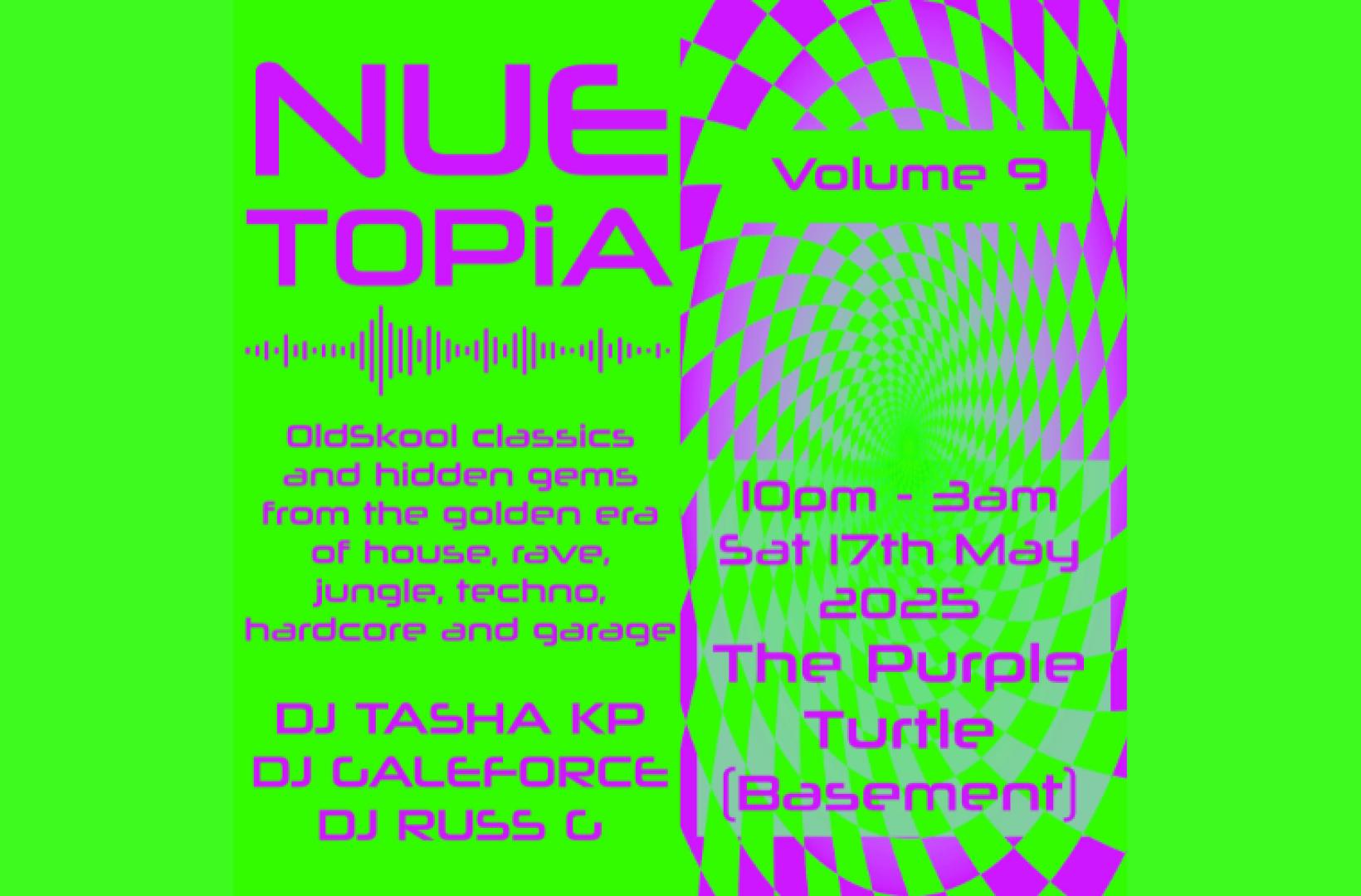 NUETOPIA Old Skool Rave and Techno With DJ Tasha KP DJ Galeforce DJ Russ G 10pm - 3am Turtle Basement FREE ENTRY / 18+ ID Required #purpleturtlereading #oldskoolrave #techno #junglemusic