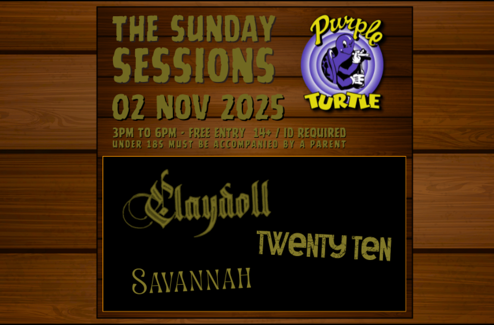 The Sunday Sessions 3 young up and coming band/musicians playing the The Turtle stage Clay Doll @claydoll.official Twenty Ten @twentyten_official Savannah (Solo) 3pm FREE ENTRY // 14+ // Bring ID U18s MUST BE ACCOMPANIED BY AN ADULT