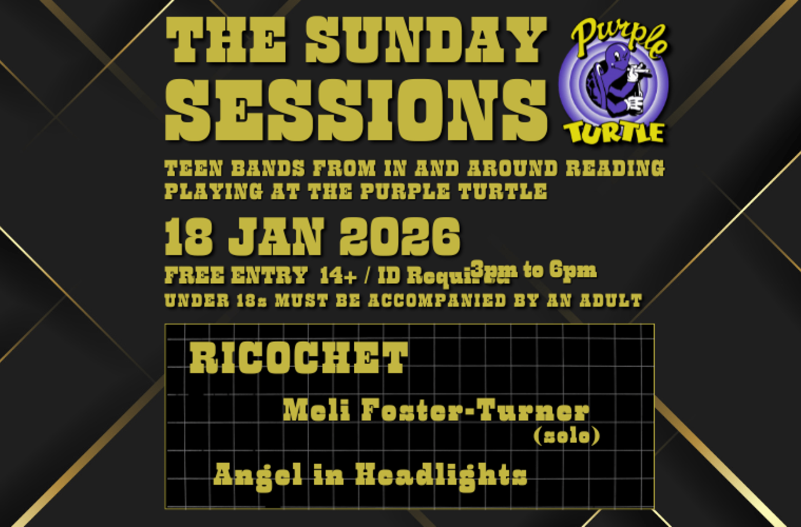 The Sunday SessionsUp and Coming Teen bands from in and around the Reading Area@ricochet431 @music_with_meli @angelinheadlightsband3pm - 6pm FREE ENTRY //14+U18s MUST BE ACCOMPANIED BY AN ADULT