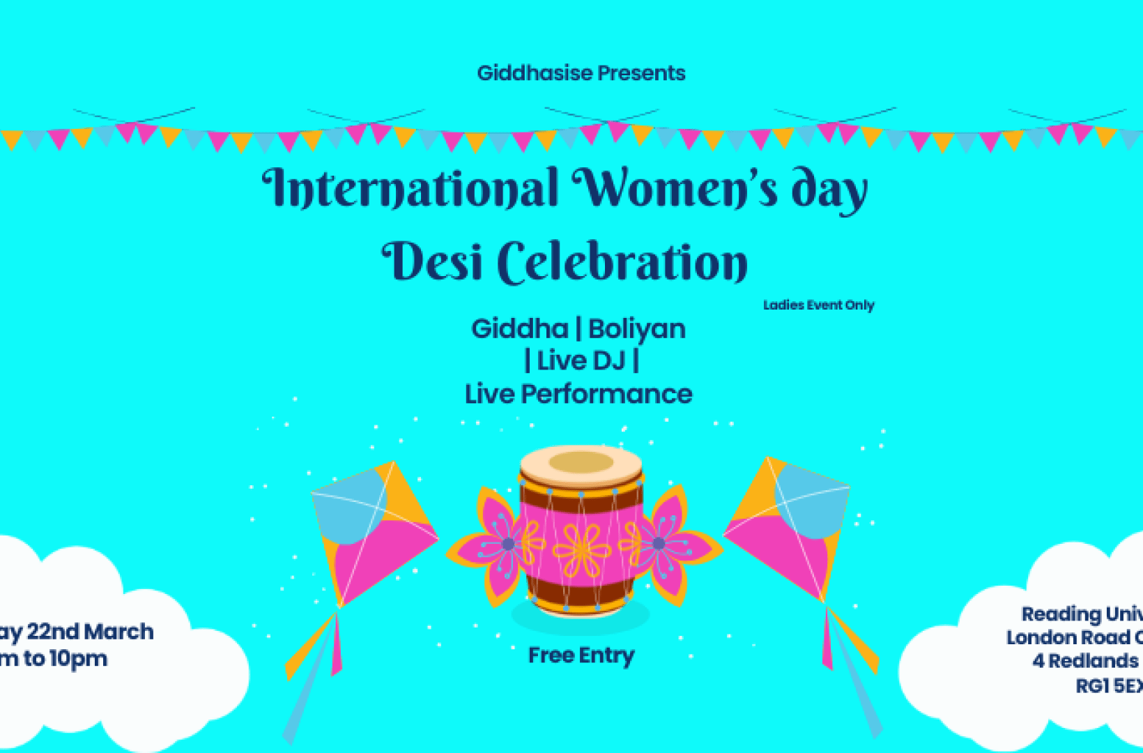 Join us for an unforgettable International Women’s Day Desi Celebration at Reading University, London Road Campus on Saturday 22nd March 2024, from 4 PM to 10 PM!