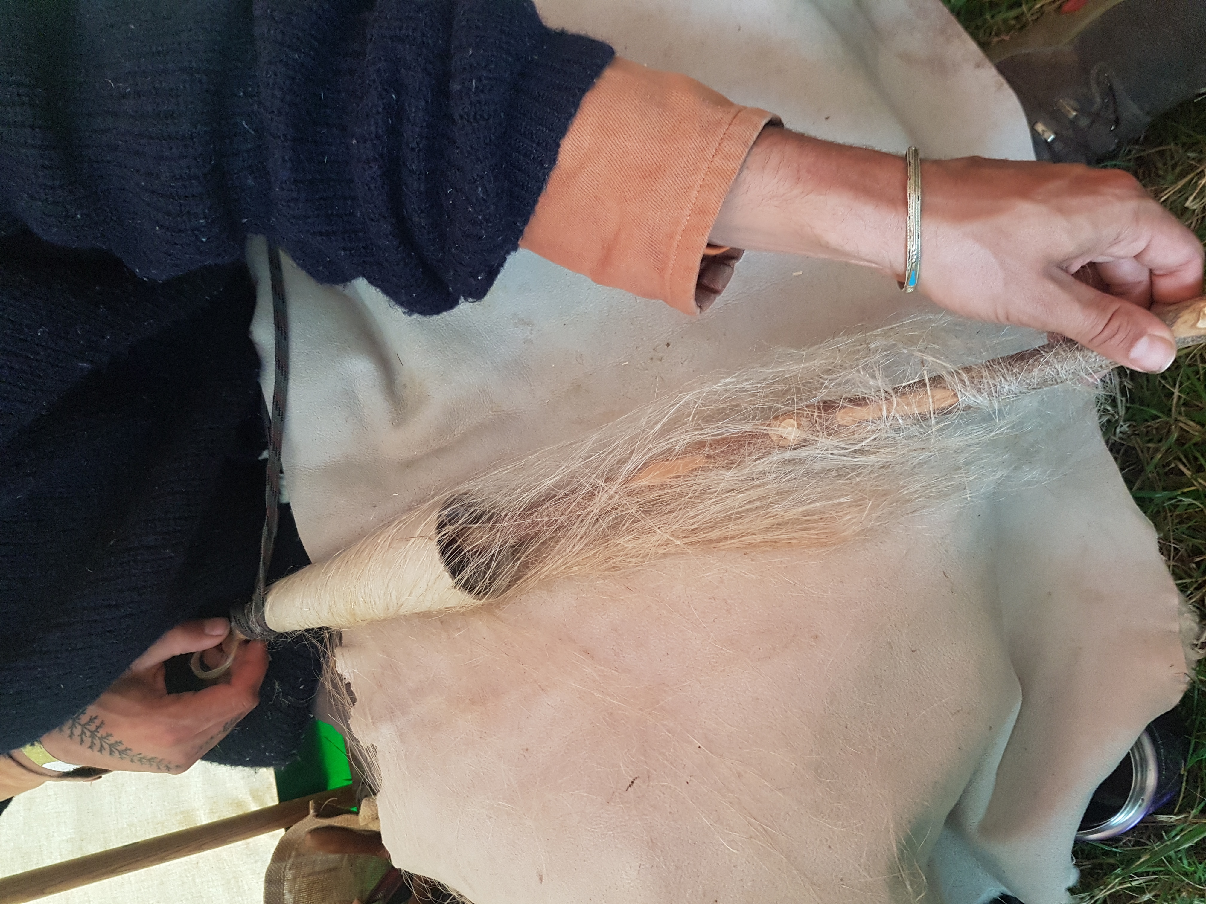 Dress a distaff and try spinning flax thread on a drop spindle.