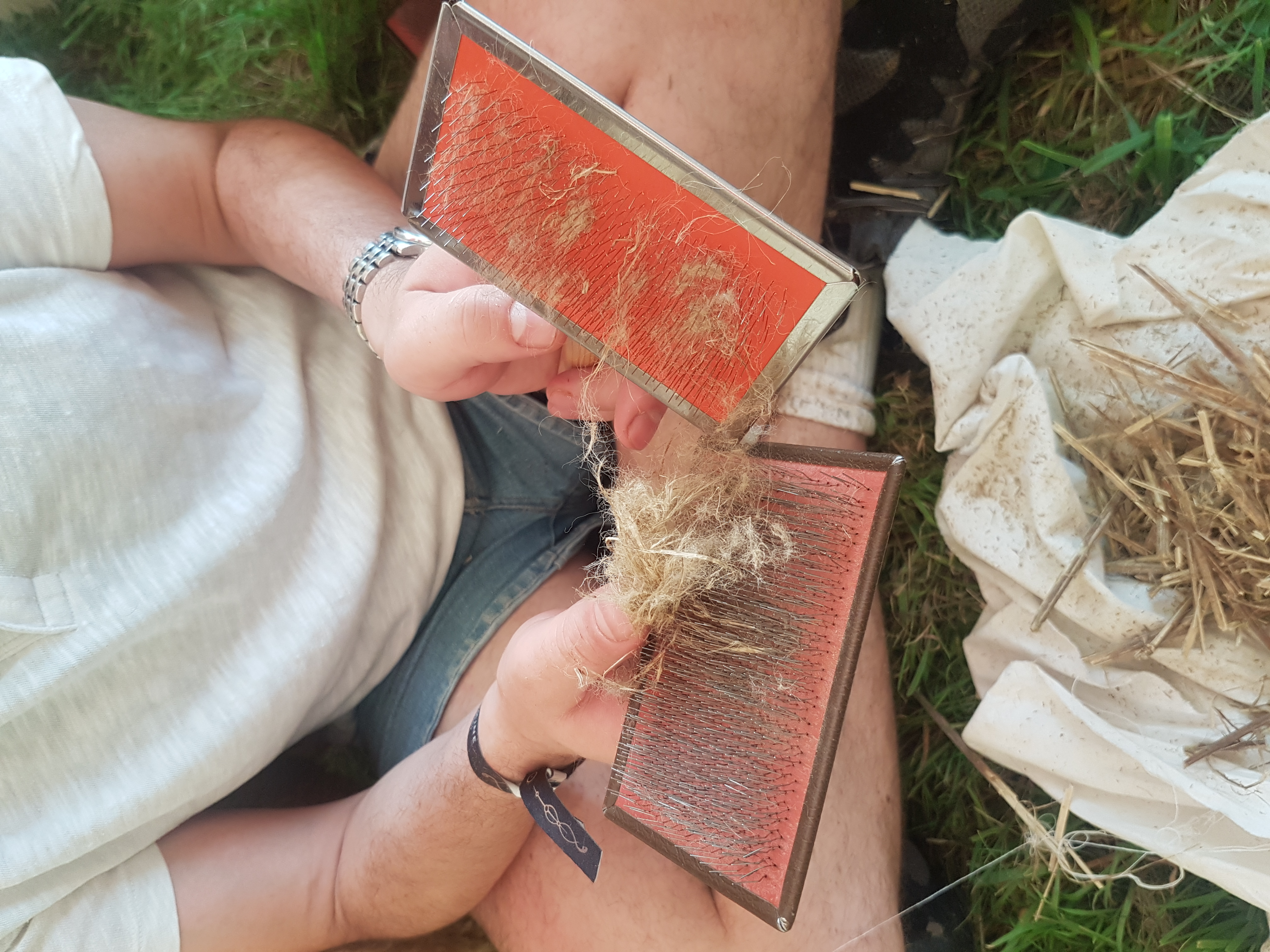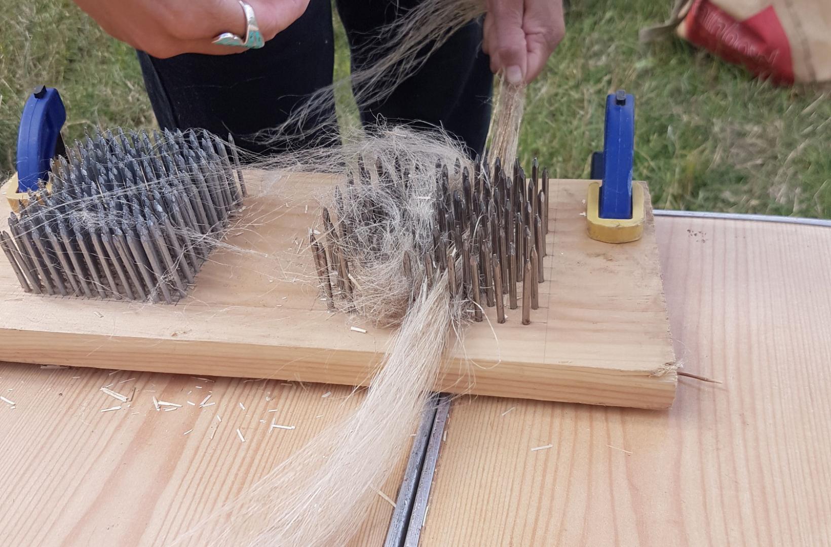 Discuss and look at examples of different retting methods for obtaining fibres from flax, nettle and hemp and have a go at hand processing retted flax fibres (breaking, scutching and hackling) to obtain both line and tow fibres for spinning.