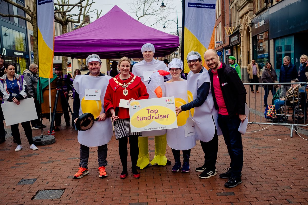 Teams of four from businesses across Reading raced in fancy dress after a lively warm up at Broad Street Mall – led by fitness instructor, Maggie Watkins. Teams then paraded to Broad Street where they flipped pancakes as they relay raced through knock-out races, semi-finals, and a gripping final, all compered by Gavin Harris from B Radio in front of an egg-static crowd of spectators, including the Mayor of Reading, Rachel Eden.