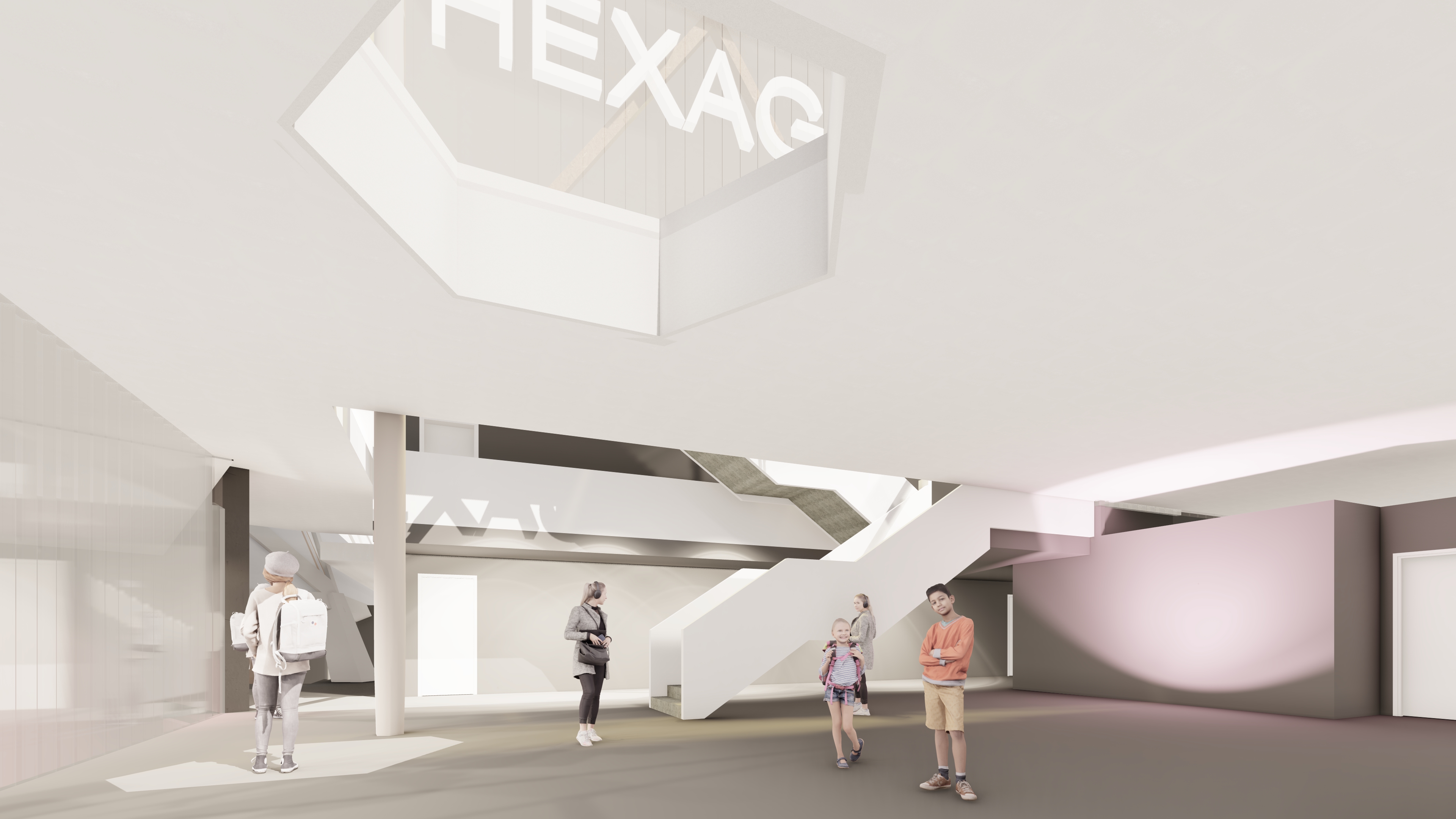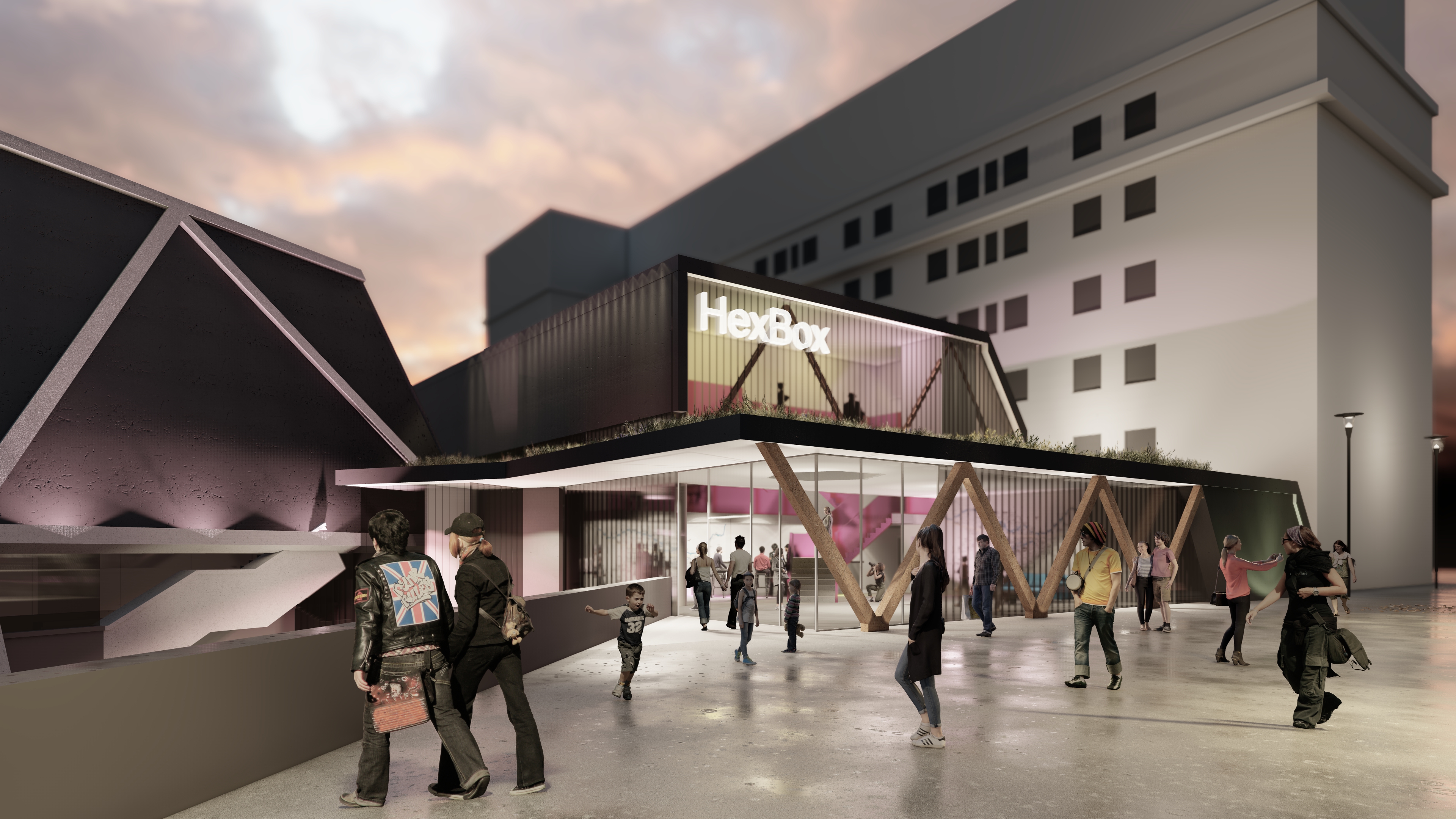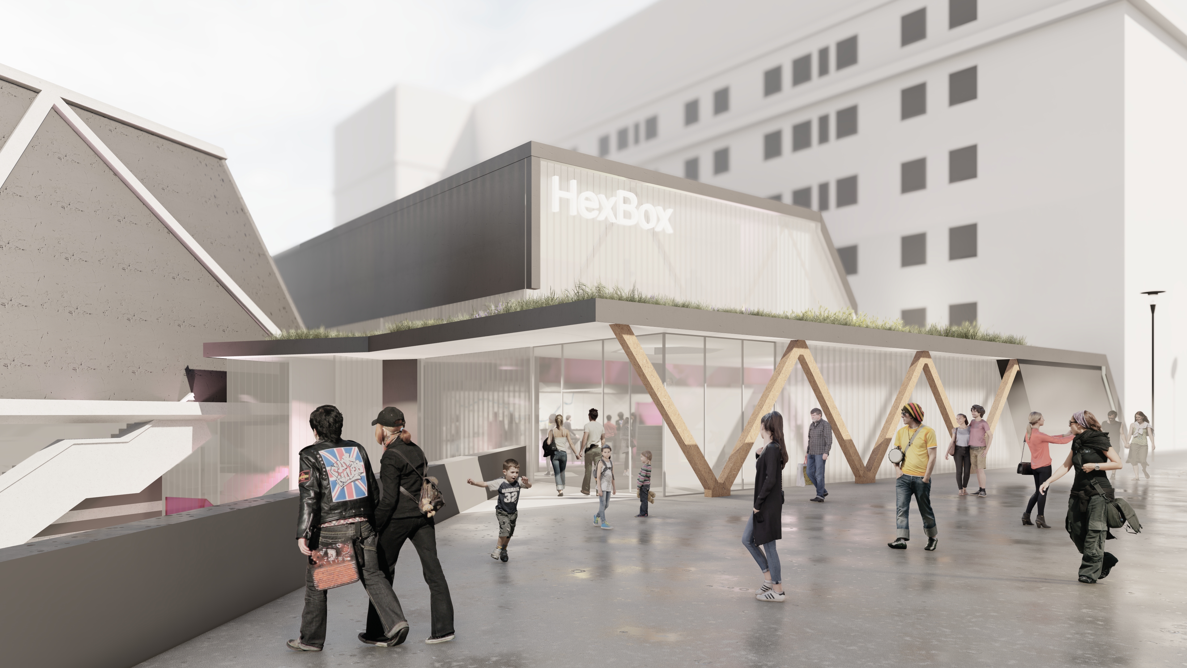 The 1970s-built Hexagon has a number of limitations for future improvements due to its design and age. The proposal is to extend to the right-hand side of the existing building with an entrance directly off Queens Walk offering much-improved accessibility and new multi-function community space, called HexBox, that can accommodate a wider variety of performances and uses. This project will form the first phase of a longer-term regeneration of the Hexagon and the wider Minster Quarter.