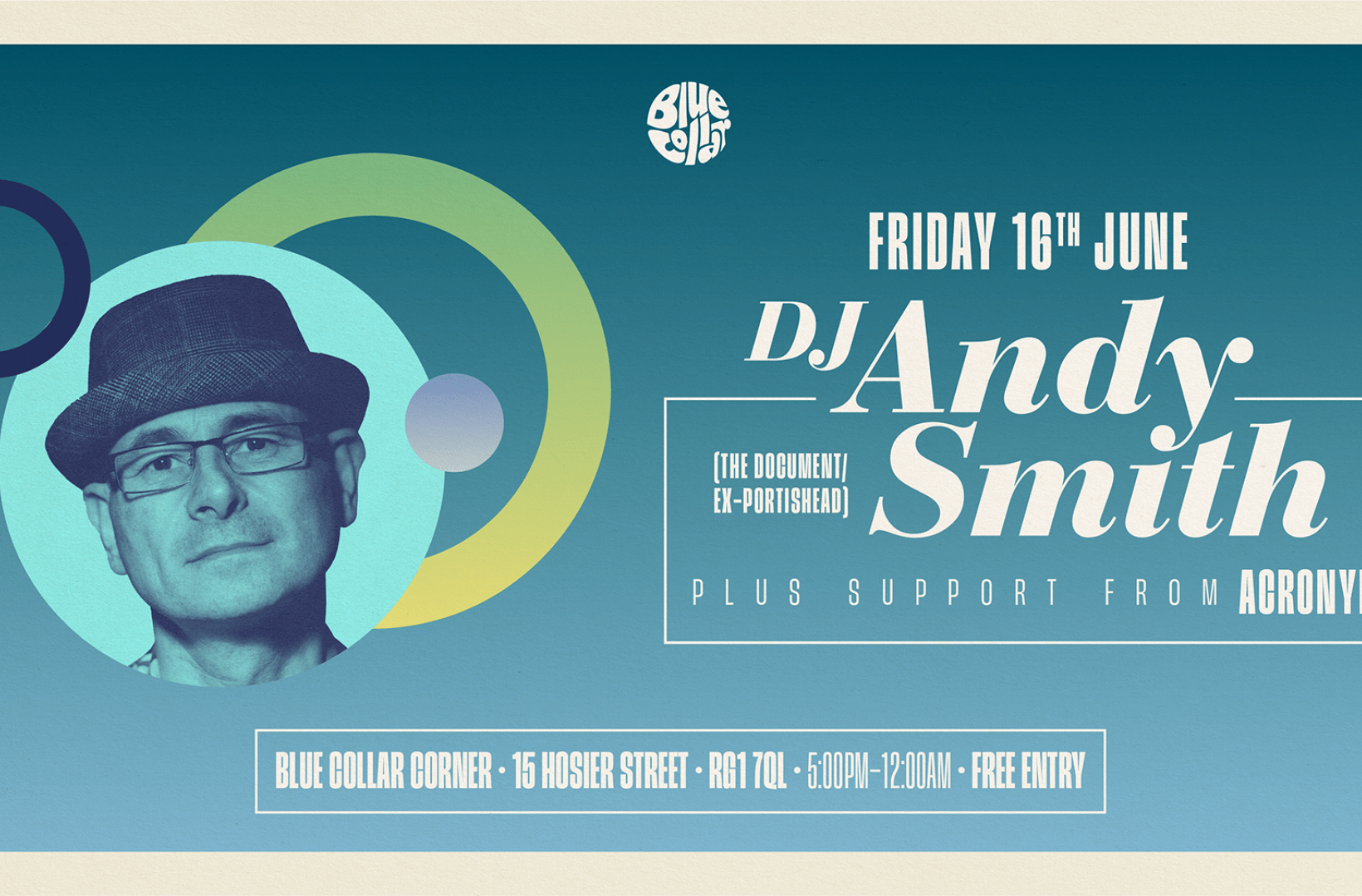 Supporting DJ Andy Smith will be Blue Collar Corner's very own genre-hopping resident Acronym. Doors open 5pm and entry is free all night (subject to capacity). Tables for eight or mare can be booked here: https://letsbookfor.com/blue-collar-corner