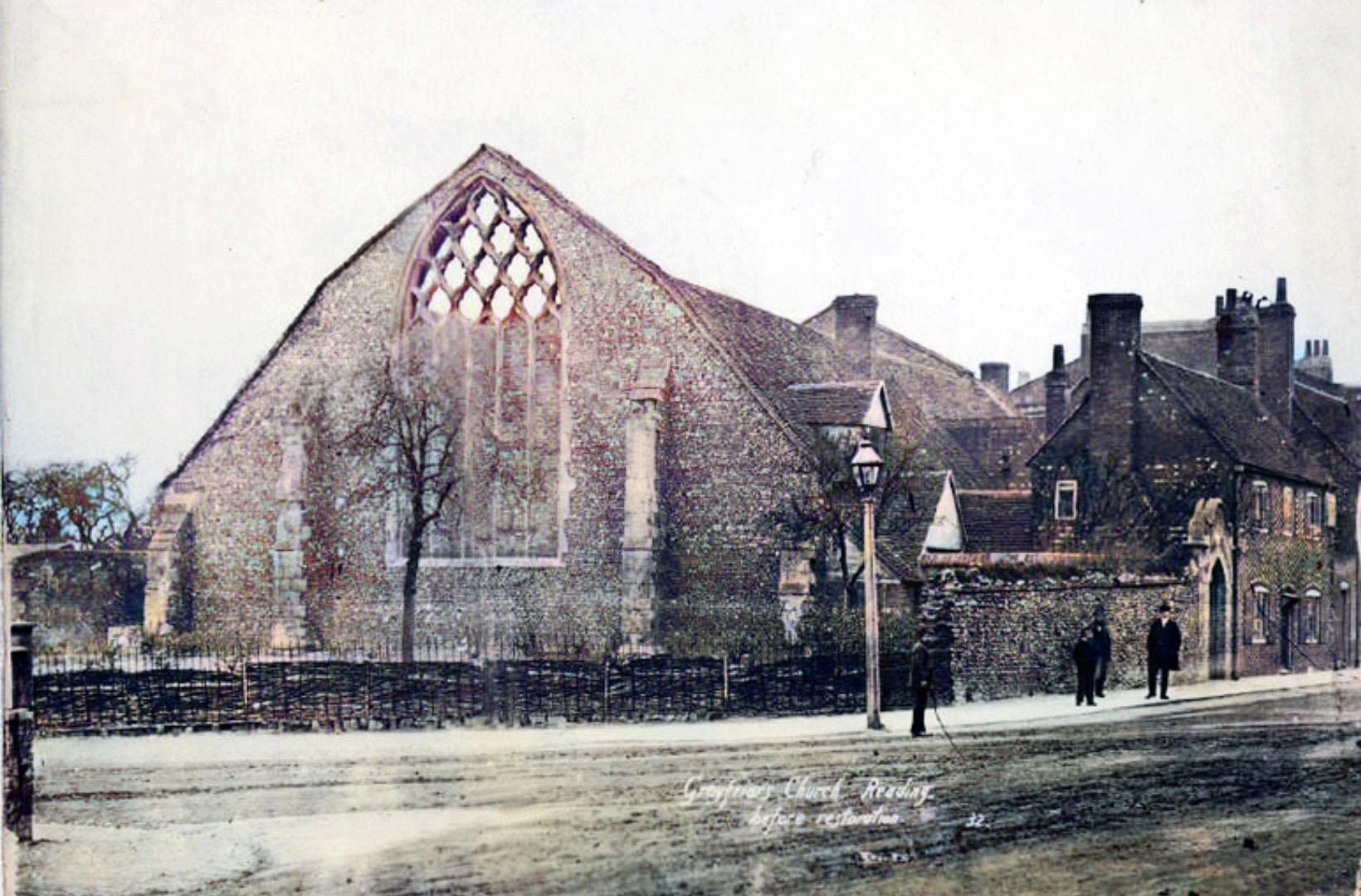 Greyfriars Church in Reading, shown in the image about 1860, started life as part of a larger Franciscan friary church, within a complex of other buildings – a chapter house, cloister, dormitory and others. When the friary was closed down under Henry VIII, the nave survived. After half a century as Reading’s town hall, it was used as a poor house, barracks in the civil war, and a prison. There was even a pub attached to it, where the south transept is now. In 1863, it re-opened as a parish church, restored and enlarged.