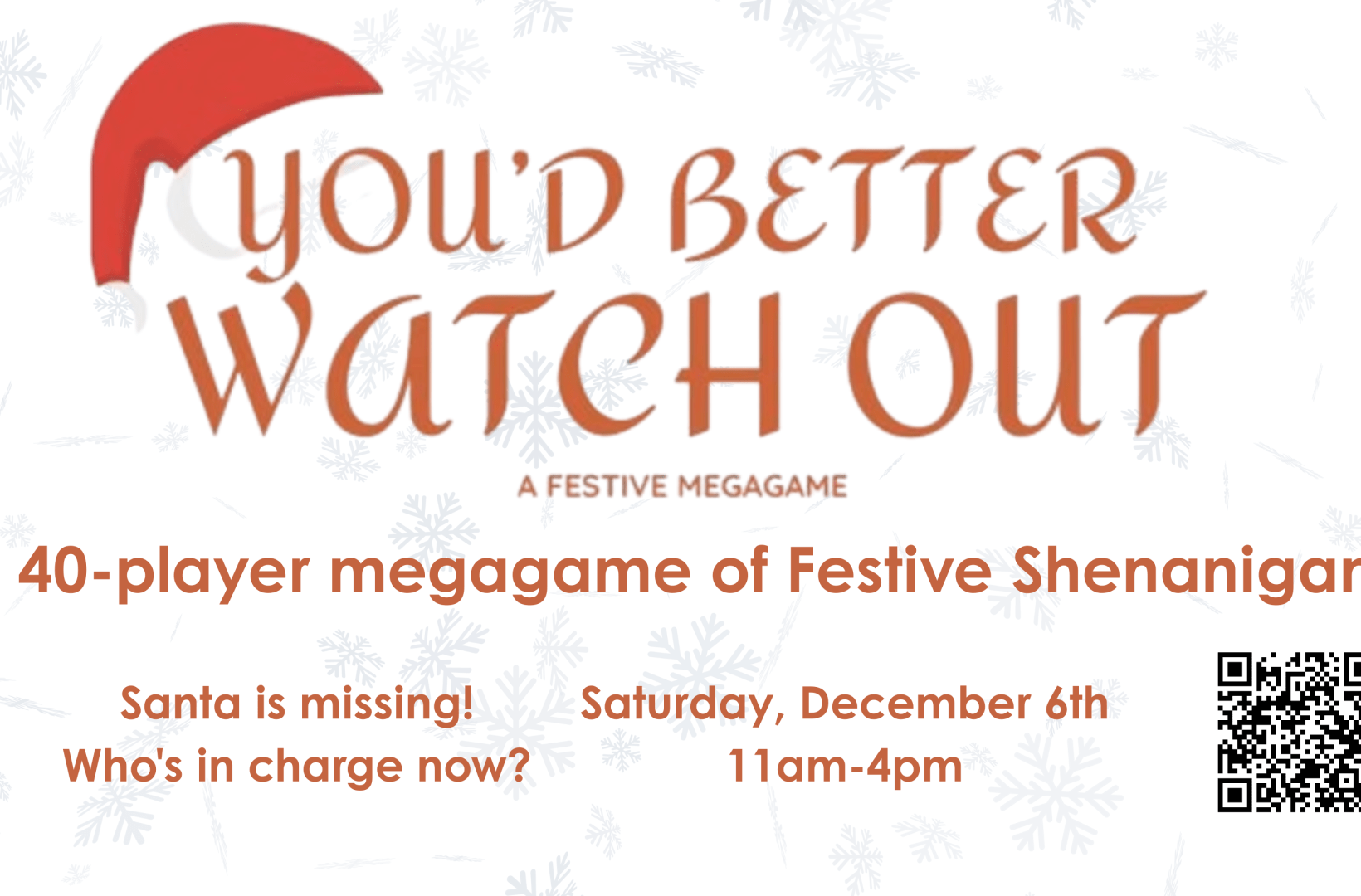 You'd Better Watch Out is a megagame - a blend of board gaming and LARP with an emphasis on communication. The game is driven by a set of easy to learn board game rules for resource management and worker placement. While these rules govern the main actions you will wish to take, the team of facilitators will give you complete freedom to take the game in whatever direction you wish. Of course, some of those directions might well lead to catastrophe...