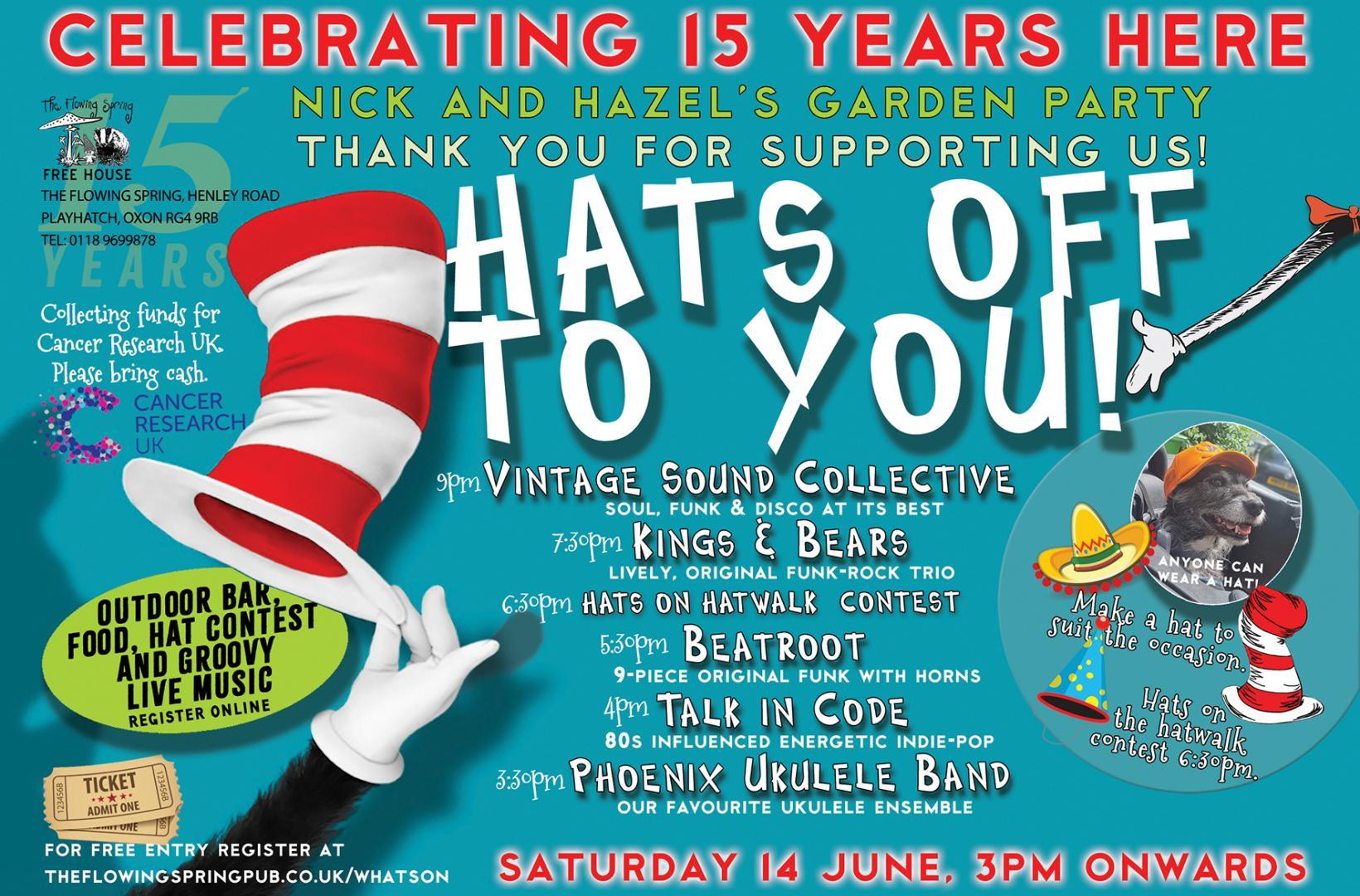Each year we hold a Hats Off party to celebrate something special. This year is particularly special to us as Nick and Hazel mark 15 years of running this wonderful, magical pub. So we take our hats off to everyone who has supported us throughout the years!