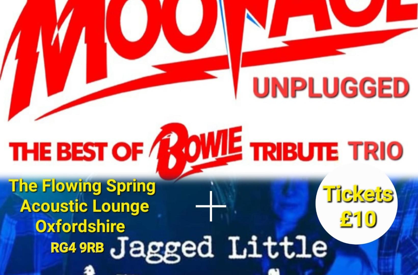 From Moonage, we're delighted to have Andrew (Bowie frontman) singing and playing acoustic guitar, Paul, the band's guitarist also on acoustic and Ollie, their keyboard player who will be on piano. They will be playing both well-known songs and lesser known album tracks. This is a one-off, not to be missed.