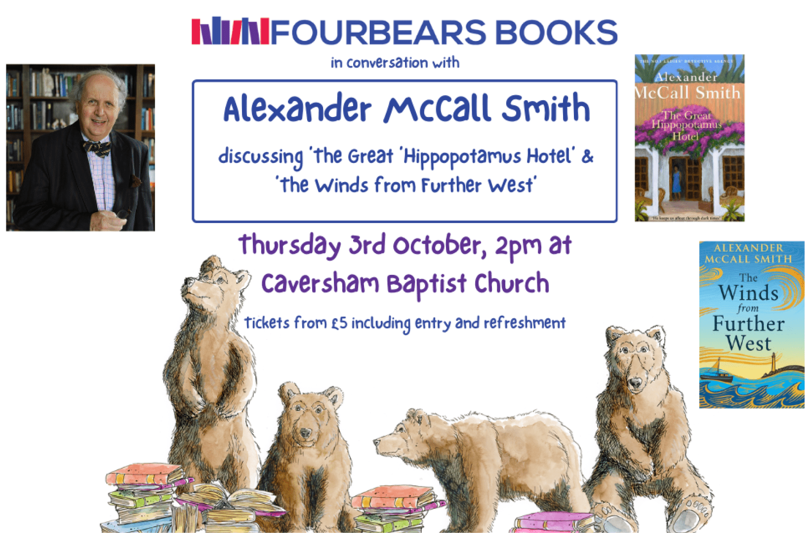 Join worldwide best-selling author Alexander McCall Smith for an afternoon of sheer delight. Travel with the master storyteller to catch up with Mma Ramotswe in Botswana as he discusses his latest No. 1 Ladies' Detective Agency novel, The Great Hippopotamus Hotel. Then allow Alexander to transport you to the west coast of Scotland, the setting for his new stand alone novel, The Winds from Further West, which tells a tale of love, Scottish islands, and wolf cubs.