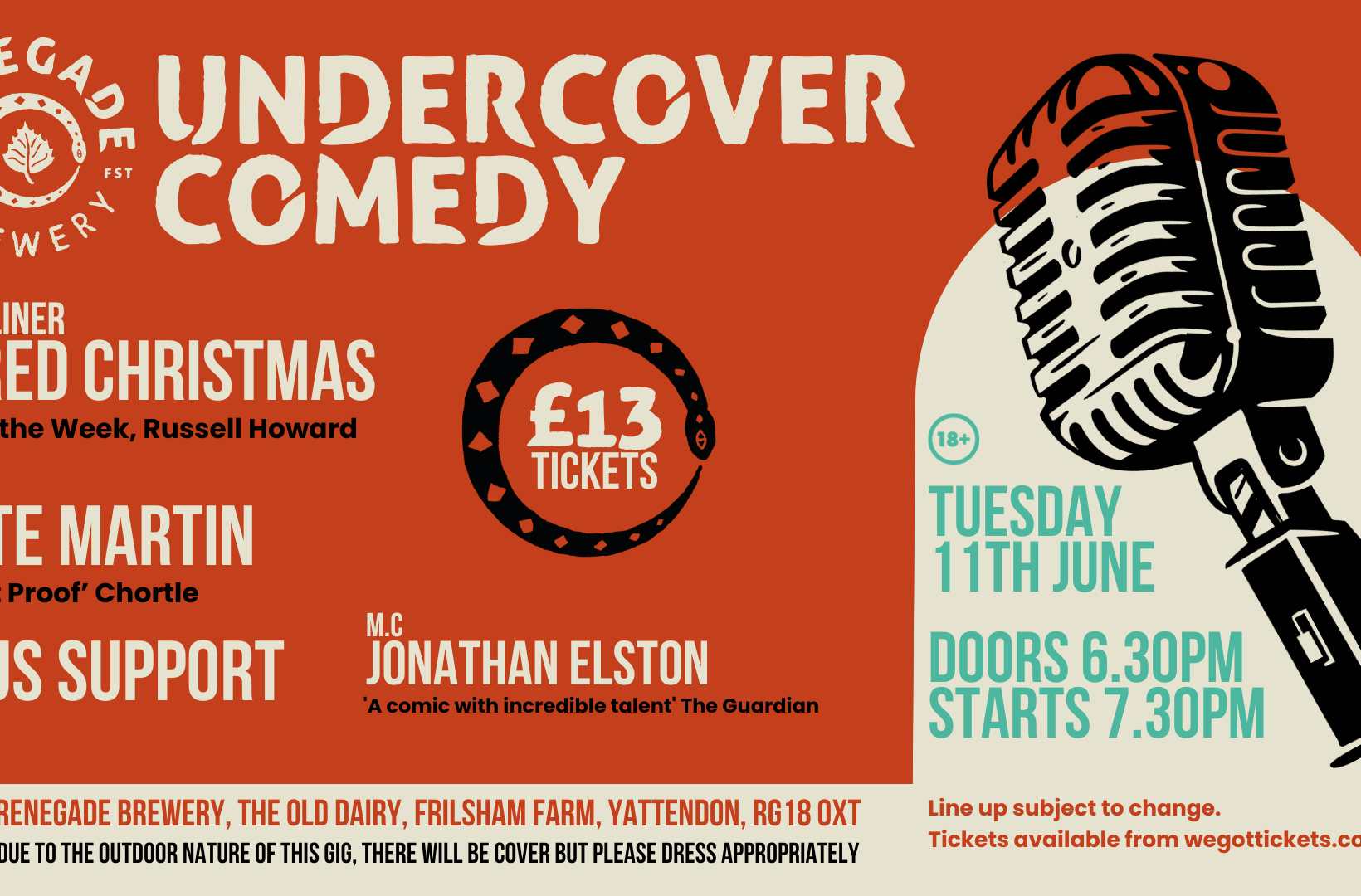 Join us for a top night of comedy at the Renegade Brewery. A night full of laughs under canvas. Featuring award winning and TV Comedians