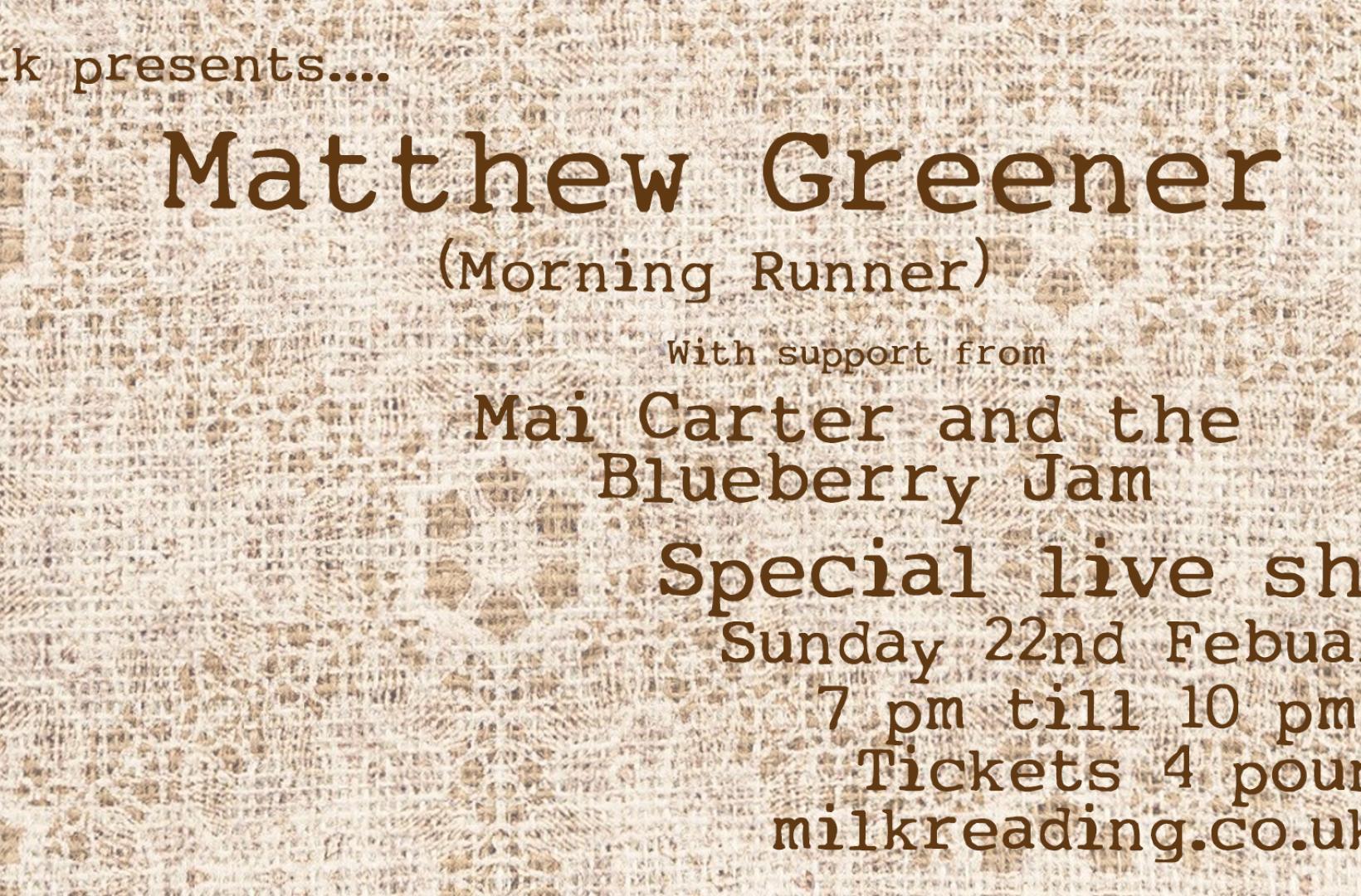 We are really happy to welcome back Mr Matthew Greener for a special live performance on Sunday, the 22nd Feb as part of our 14th birthday celebrations! Matthew is best known for his band Morning Runner, and he puts on quite the moving solo show, too. Support from the top Mai Carter and the Blueberry Jam. Highly recommended.