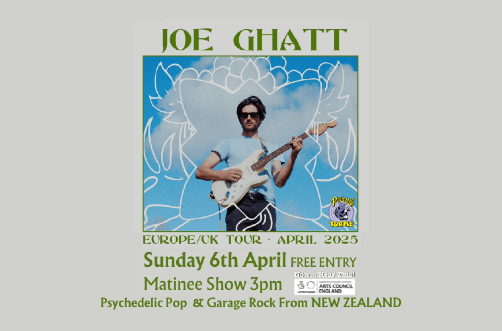Originally from the sunny town of Nelson, Aotearoa/New Zealand, these days Joe Ghatt mostly resides in and around Auckland. In a live setting; Joe and his energetic 5 piece band transform his humble recordings into a huge, jammy, psychedelic rock show that engages fans and compels everybody to dance. Joe Ghatt’s 2019 cult-acclaimed debut LP Banana Sludge (released by Third Eye Stimuli Records (AUS) and Six Tonnes de Chair (FR)) is a charming lo-fi psych-surf album, featuring hit singles such as the 60s inspired psychedelic-rock number, ‘Farewell’, the hypnotic fuzz guitar jam, ‘Mammon’ and the trippy surf instrumental, ‘While The Coffee Brews’. Joe Ghatt’s eagerly-awaited sophomore album, Caper, is set for release in May 2024.