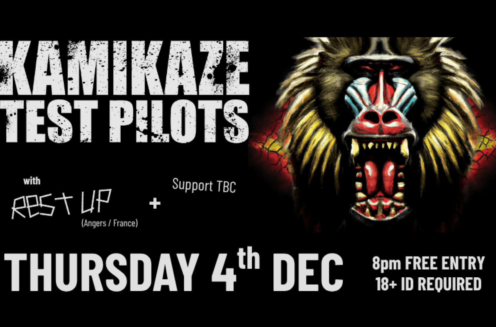 KAMIKAZE TEST PILOTS @kamikazetestpilots Genre bending, big riff, heavy, alt-rock Reading locals return to The Turtle. With Rest Up (France) @restupband support TBC 8pm FREE ENTRY // 18+ ID Required