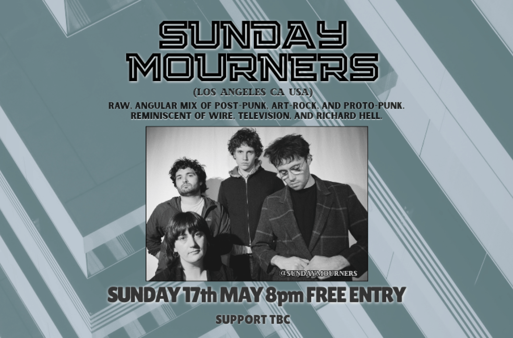 @sundaymourners (LA USA)Raw, angular mix of post-punk, art-rock, and proto-punk.Reminiscent of Wire, Television, and Richard Hell.Supoort TBC8PM - FREE ENTRY / 18+