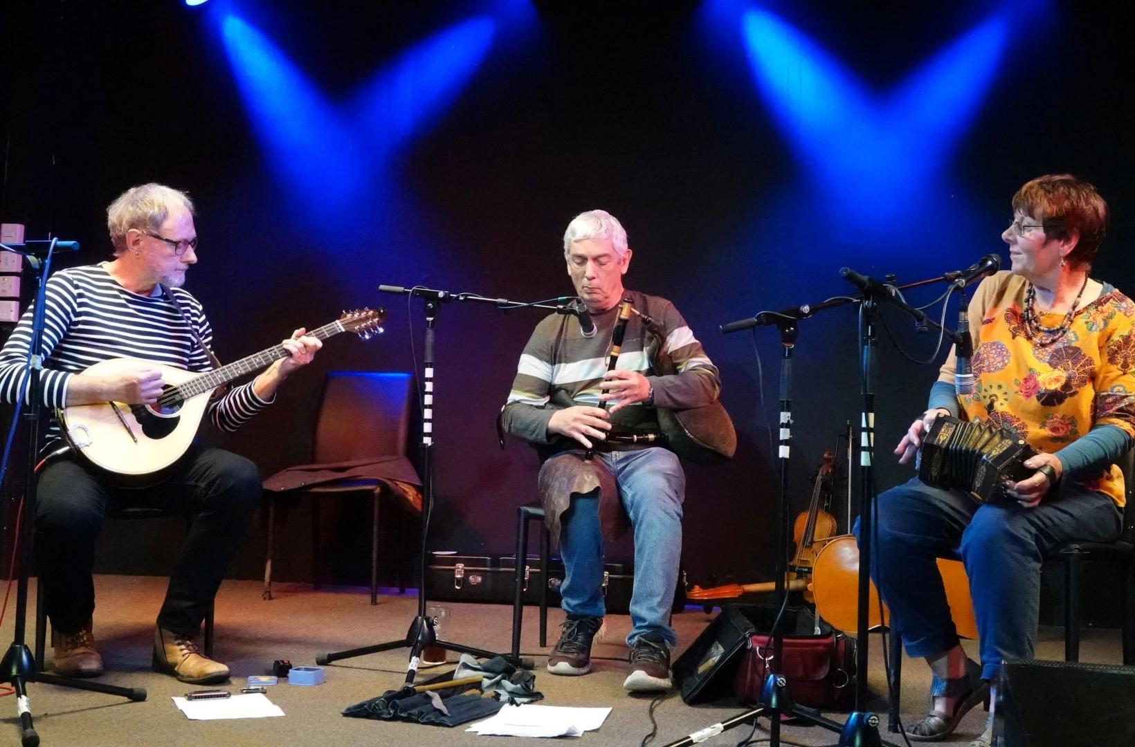 The line up is: Sara Daniels - concertina, vocals and guitar, Paul Hancock - Uillean pipes and whistles and Mark Turauskis.- bouzouki and bodhran.