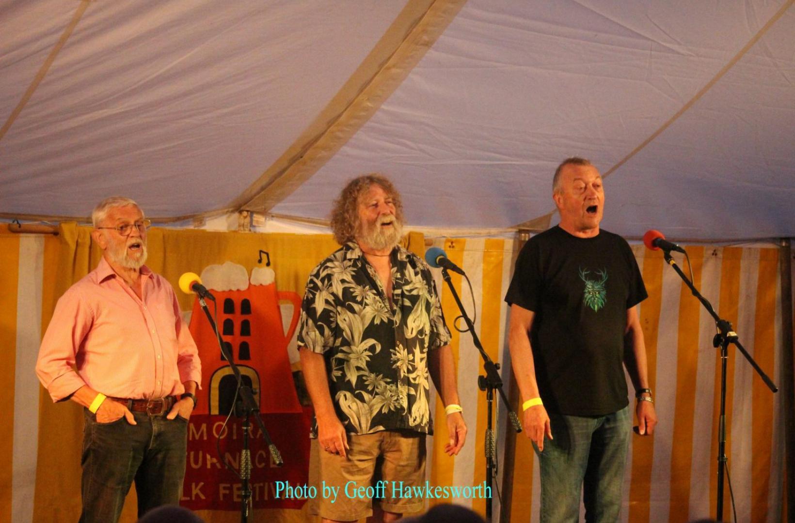 Most of their material comprises English traditional folk songs but they also sing some shanties and an increasing number of the many fabulous contemporary songs that are coming into the tradition. Almost all of their songs have big choruses, and they say that "audience participation is mandatory; just sitting and listening is not an option".