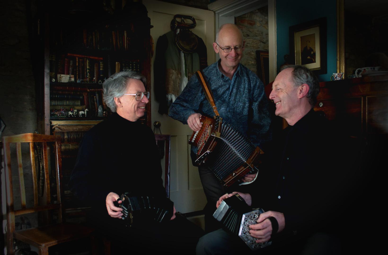 Firmly rooted in the English tradition, Three Pressed Men perform wonders with voices, hammer dulcimer, guitar, accordions, harmonica … and lots of concertinas! Our music embraces many moods  and styles – striking a cappella harmonies, sensitive ballads, lively dance music and rousing choruses.
