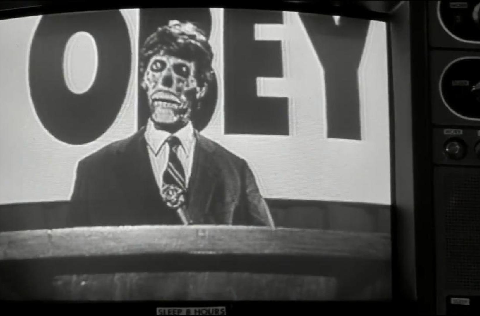 Nada, a down-on-his-luck construction worker, discovers a pair of special sunglasses. Wearing them, he is able to see the world as it really is: people being bombarded by media and government with messages like “Stay Asleep”, “No Imagination”, “Submit to Authority”. Even scarier is that he is able to see that some usually normal-looking people are in fact ugly aliens in charge of the massive campaign to keep humans subdued.