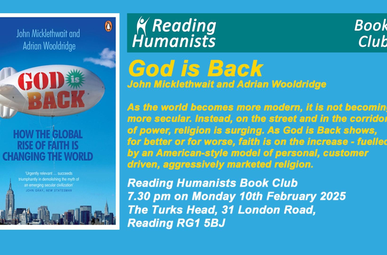 Join us for a lively and stimulating discussion with like-minded people in a relaxed atmosphere. For our next book we've decided to discuss God is Back by John Micklethwait and Adrian Wooldridge.