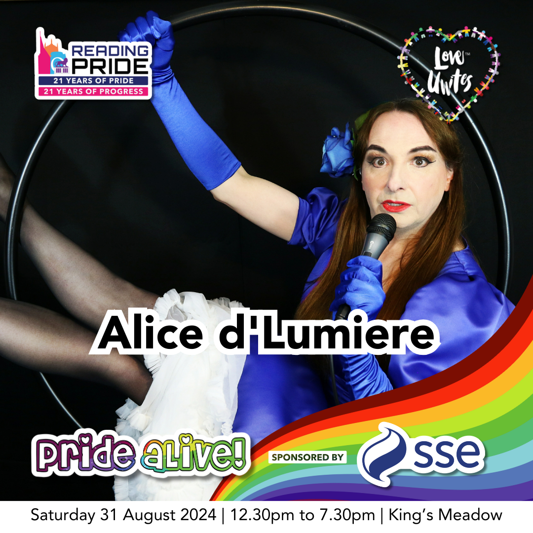 Alice d’Lumiere This year we are proud to welcome Alice to the Pride aLive stage. Alice will be performing some short spoken word at several different times throughout the day between the act change overs.