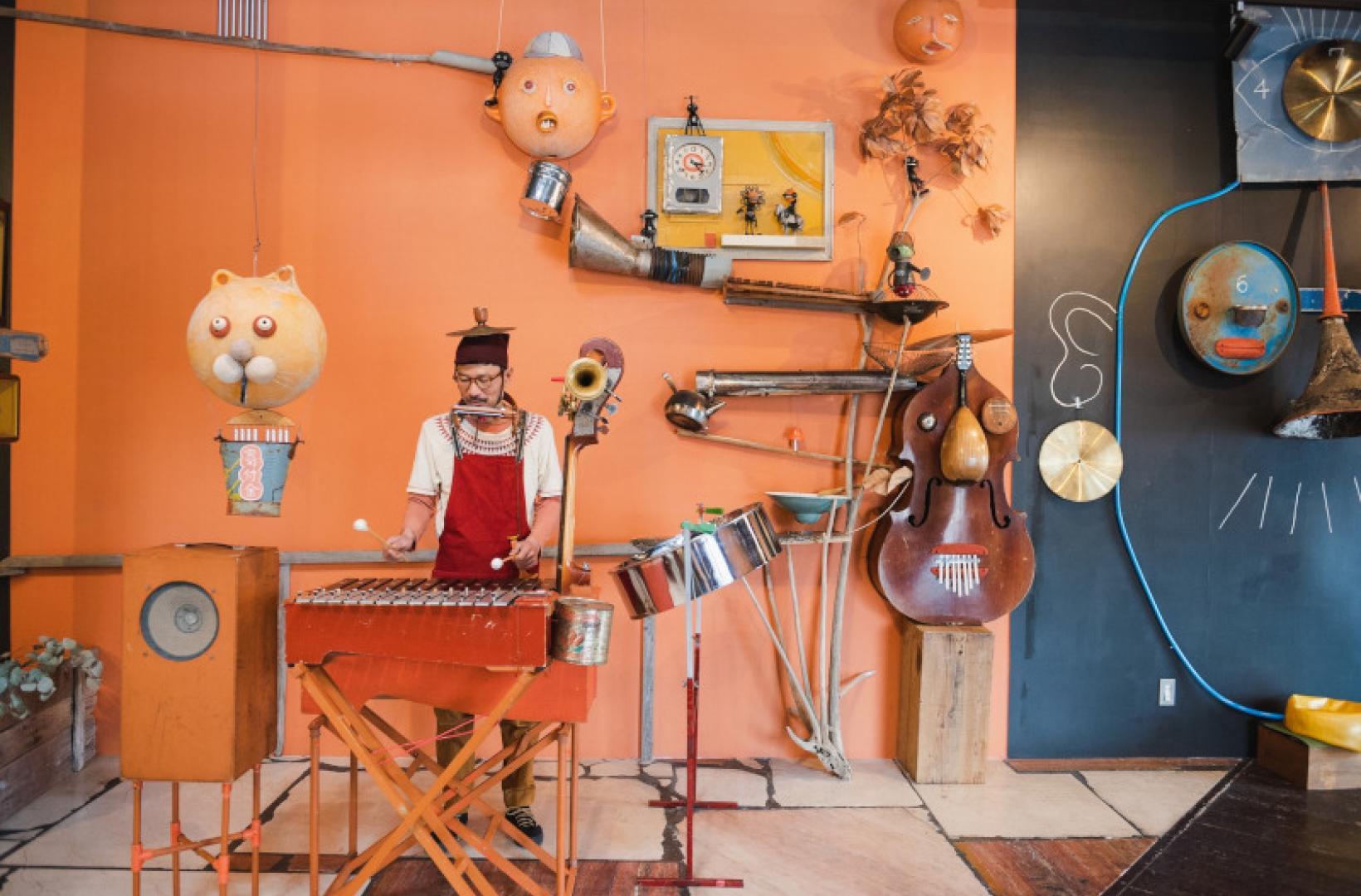 ICHI, from Nagoya in Japan, takes the notion of a one-man band to new limits, combining his quirky handmade instrument inventions (Stilt-bass, Kalilaphone, Balloon-pipes, Hatbox-pedal-drum, Tapumpet, Percussion-shoes & Hattrick-hat) with steel-drum, ping-pong balls, typewriter, toys & everyday objects all in the space of one short set. Somehow there's an ancient, ritualistic feel to his performances - he's like the misplaced leader of a tribe. To see ICHI live is to witness something so playful and unusual you know that you're experiencing something entirely new.