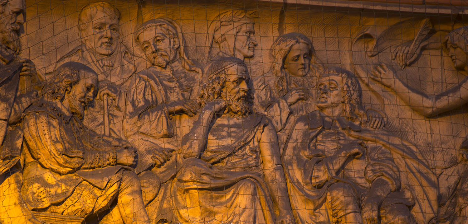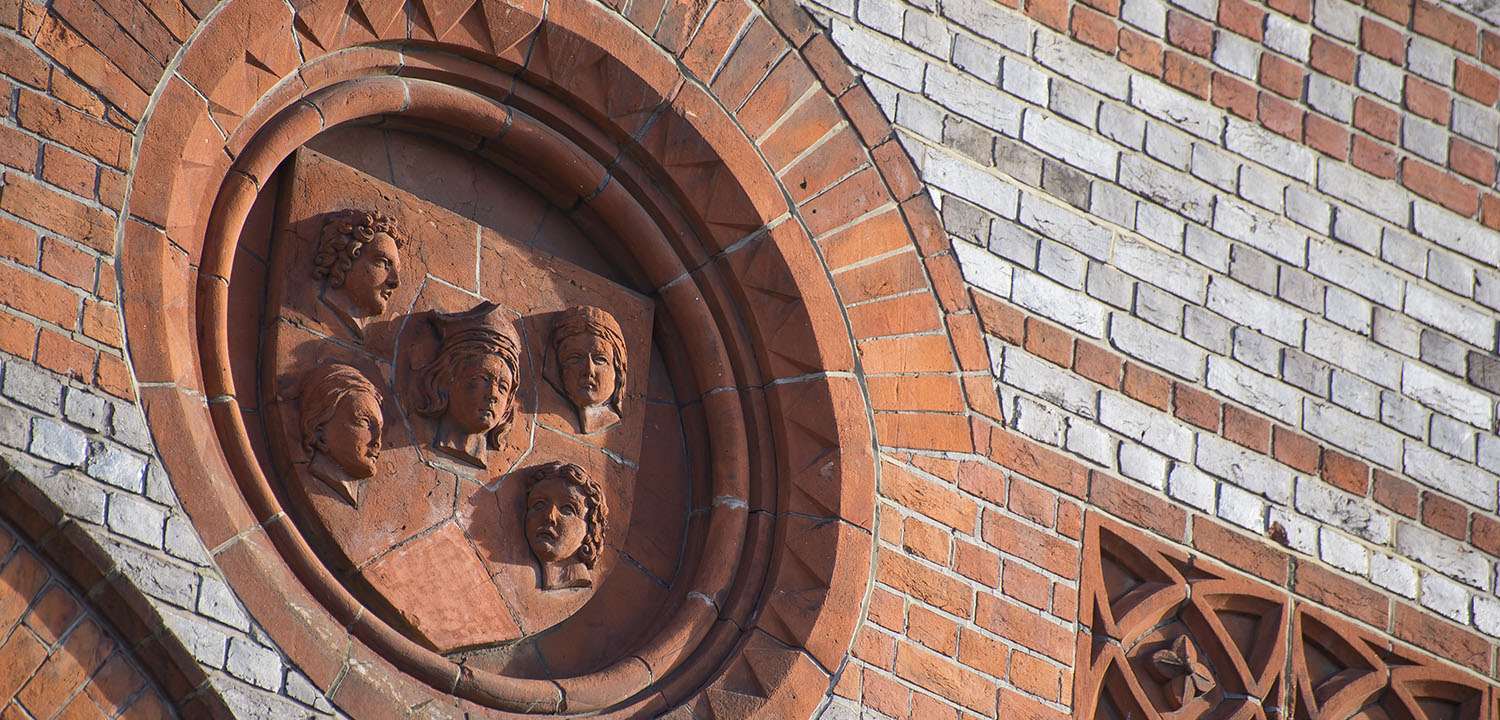 The corner of the 1897 Art Gallery has a terracotta frieze made by Reading brick makers S & E Colliers. The first panel shows ancient British life including an Iron Age blacksmith. The second panel depicts scenes of Roman life. The third panel features Tennyson, Shakespeare, Burns, Milton, Chaucer, Homer and Dante, while the final panel celebrates nineteenth century scientific achievements such as Edison’s telephone.
