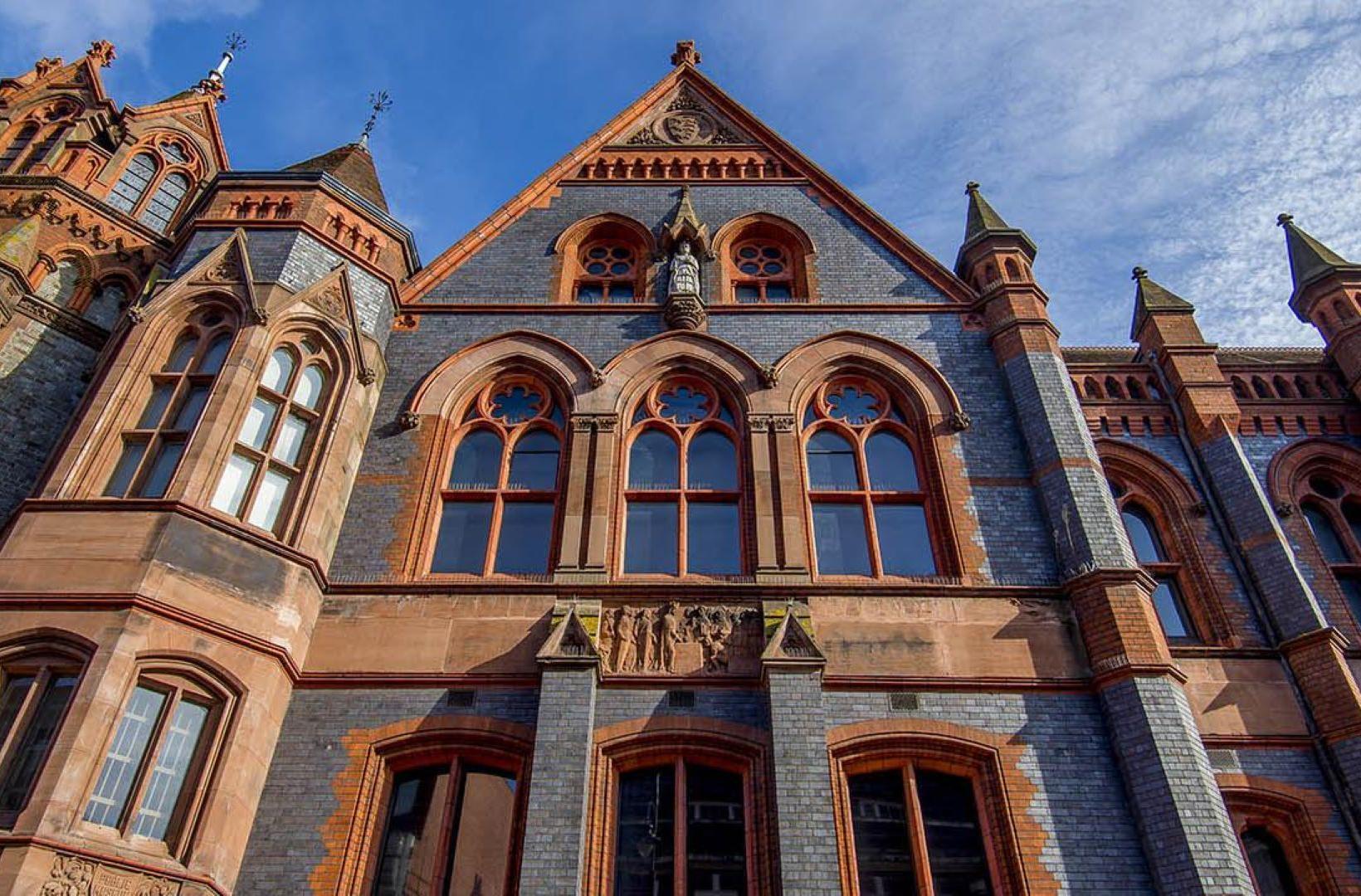 Waterhouse added the clock tower, council chamber, Mayor's rooms and offices in 1875. They are built of locally made red and grey bricks with terracotta panels. He skilfully wrapped his new building around the existing Small Town Hall, enjoying the challenge of a constricted site. His principle of design was to ‘first get your plan right – then the skyline – then fill in’. He then carefully placed the clock tower for views from Friar Street and Market Place.